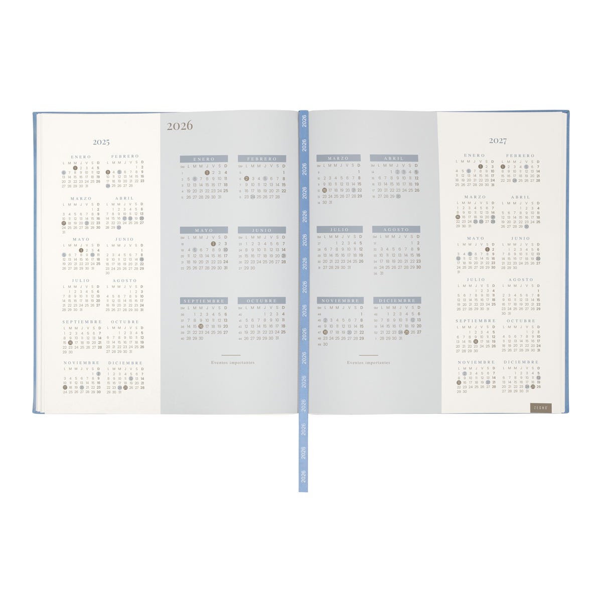 Agenda semanal con 80 hojas. Contiene datos personales, calendarios 2025-2026-2027, planeador 2026, presupuesto de gastos, seguimiento de nuevos hábitos, organizador de tareas, planeador de proyecto y días festivos. Incluye caja individual.