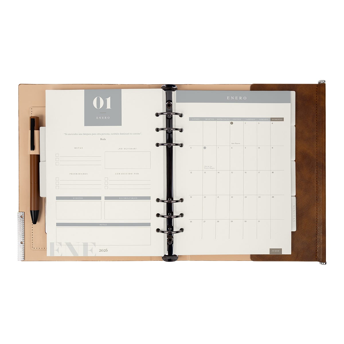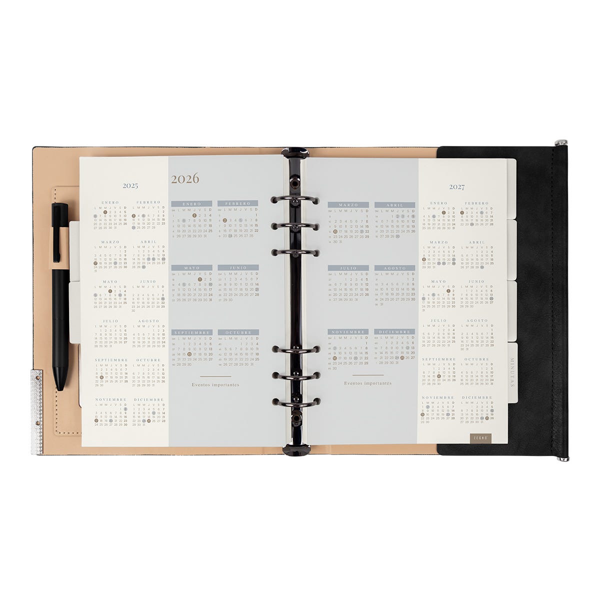 Agenda semanal con 140 hojas. Contiene datos personales, calendarios 2025-2026-2027, planeador 2026, presupuesto de gastos, seguimiento de nuevos hábitos, organizador de tareas, planeador de proyectos y dÃas festivos. Incluye 7 secciones de separador de cartón, 3 hojas con stickers, bolÃgrafo metálico y caja individual tipo regalo.